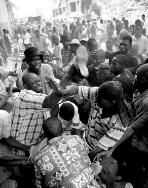 | 1月24日,在海地首都太子港,街头摆摊的小贩(左)与试图哄抢商品的人对打。 新华社/法新 |