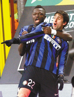 1月25日,在意甲第21轮比赛中,国际米兰队主场以2:0战胜AC米兰队。图为国际米兰队球员米利托(右)在进球后与队友蒙塔里庆祝。 新华社发