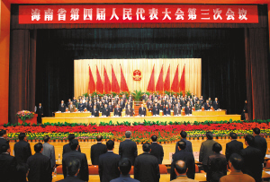 | 1月25日,海南省第四届人民代表大会第三次会议在省人大会堂隆重开幕。图为大会现场。 本报记者 宋国强 摄 |