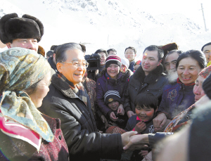 | 这是1月23日,温家宝在雪灾严重的阿勒泰市郊区的拉斯特乡散德克村察看灾情,看望哈萨克族牧民群众。 新华社记者 李学仁 摄 |