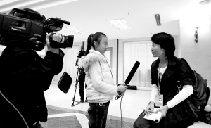 1月26日,在分组审议会场,海南电视台少儿频道小记者曾金稚就两会关注话题采访法制时报一名记者。 本报记者 李英挺 摄