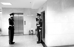 1月26日,在省人大会堂分组会议室区,两名武警战士在交接岗。 本报记者 宋国强 摄