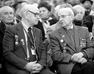 1月27日,波兰在位于南部的纳粹奥斯威辛集中营遗址举行仪式,纪念集中营解放65周年。奥斯威辛集中营是纳粹德国在第二次世界大战期间在波兰境内设立的最大的集中营,包括大批犹太人在内的约110万人被杀害。 图为曾参与解放奥斯威辛集中营的苏联红军老兵交谈。 新华社/法新
