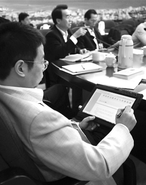 ↓ 图为人大代表在笔记本电脑上手写输入其他代表发言。 本报记者 李英挺 摄 ↑ 智能签到系统,代表们佩戴出席证经过入口感应设备时,就可以识别身份显示签到。智能签到系统最大的好处就是减少了人力,同时一目了然,便于人数统计。 本报记者 李英挺 摄