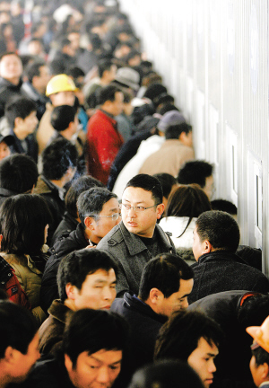 1月28日,上海火车站临时搭建的车票大卖场内挤满了等待回乡的人们。 随着铁路上海站进入春运购票高峰期,上海至东北、西南、西北等方向的火车票票额十分紧张,“一票难求”的现象普遍存在,热门线路运力不足的矛盾依然突出。据悉,今年春运期间,上海铁路局在上海全市开设售票窗口达728个,比2009年增加255个,增长53.9%。 新华社记者 陈飞 摄