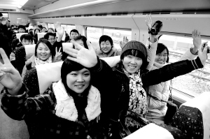 | 2月6日,旅客在郑州开往西安G2003次“和谐号”动车组列车上向记者招手致意。 新华社记者 朱祥 摄 |
