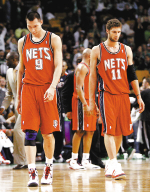 2月6日,新泽西网队以87比96不敌波士顿凯尔特人队。图为易建联(左)神情沮丧。 新华社发