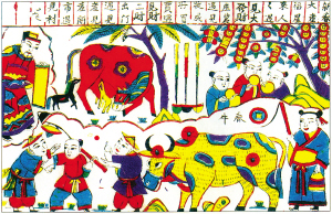 这里重点要说的是立春日的迎春。立春在阳历的二月四日或五日,不同的年份,该日或在春节之前,或在春节之后,但其迎春活动,同春节的喜庆是联为一体的。迎春活动的主体是鞭春牛,旧时用以表达劝农和春耕的开始。宋孟元老《东京梦华录》云:“立春前,开封府进春牛入禁中鞭春。开封、祥符两县,置春牛于府前,至日绝早,府僚打春,如方州仪。”而《正德琼台志》对于此俗的记载更为详细:“迎春日,府卫官盛服至于东郊迎春馆,武弁各竞办杂剧故事,会聚逞炫。俟祭勾芒神毕,前导,城市内外老稚集于通衢,各携妇幼,男女竞看士牛自河口街从西门(或南门)入府,将豆谷洒之,谓消压痘疹。是日以面饼裹生菜诸肉品啖之,曰春饼。”《道光琼州府志》所记文字略有不同,如“迎春日”作“立春前一日”,“府卫官”作“府县官”,“武弁”作“街坊”,吃春饼作“亲邻以春饼相馈遗”,但大体程序是相同的。苏轼贬琼时,有《减字木兰花·海南春词》记此盛况,气氛异常浓郁:“春牛春杖,无限春风来海上。便丐春工,染得桃红胜肉红。春幡春胜,一阵春风吹酒醒。不似天涯,卷起杨花似雪花。”可知迎春习俗从北至南,从宋到元至明清乃一脉相承。