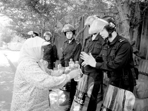 特警队员的辛劳,当地的群众看在眼里,记在心上。赵茂良说,许多次他在执勤中感到口干舌燥时,当地的群众热情地送水或水果,这些群众有汉族的,也有少数民族的。有的人开着车,经过时看到特警队员,也会停下车送一瓶水过来。“这种时候我特别感动,再苦再累也值!”赵茂良说。