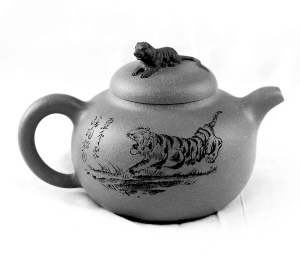 省藏协理事陈大授有一只紫砂壶,也以虎为主题。只见,壶盖上一只卧虎正逍遥自在;壶身上两只猛虎遥相呼应,一只仰天长啸,一只回头叫嚣,在黄色的段泥紫砂上栩栩如生。