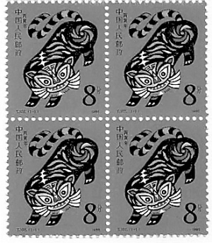 1998年1月5日,邮电部发行1998—1《戊寅年》特种邮票一套2枚,面值共200分,采用影雕套印。邮票图名分别为:虎虎生威、气贯长虹。第1枚是山西省黎城布老虎的正面像。小老虎四肢叉开,虎头正对前方,两只耳朵竖立。粗壮有力的尾巴高高翘起,显示出它活泼旺盛的生命力;第2枚取唐代大书法家颜真卿所书《裴将军诗》中的草书“虎”字为图。