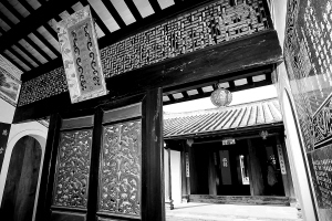 在蓝美村林家大宅的门口,高悬着“振威第”三个金色大字,对联云:“振兴琼闽千秋泰,威镇台澎万户安”。走进宅内,一重重木制的房屋结构宽敞明亮,檐间彩绘的喜鹊栩栩如生。据林小平介绍,这座宅子是2006年族人集资翻新过的,之前的老宅因为年久失修而摇摇欲坠,许多家具和器物都丢失了。
