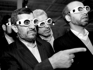 2月7日,在伊朗首都德黑兰,伊朗总统艾哈迈迪-内贾德(前左)在伊朗激光技术成就展览会上参观。 艾哈迈迪-内贾德当天下令让伊朗原子能组织为生产纯度为20%的浓缩铀着手相关工作,但同时表示伊朗仍然愿意就核燃料交易问题与有关国家进行磋商。 新华社发(哈拉比萨斯摄)