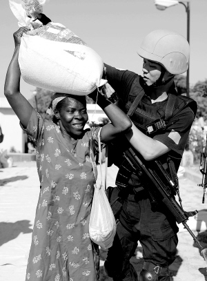 2月2日,在海地首都太子港的一个粮食发放点,一名中国赴海地维和警察防暴队队员帮助当地居民领取救济粮食。