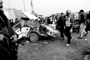 至少19人死亡 2月10日,在巴基斯坦西北部靠近阿富汗边界的开伯尔部落地区,救援人员查看在自杀式炸弹袭击中被炸毁的车辆。开伯尔部落地区当日发生自杀式炸弹袭击,一名自杀式袭击者扑向当地警方一辆巡逻车,造成至少19人死亡,其中包括11名部落警察。 新华社发