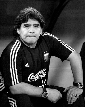 | 11日,在阿根廷马德普拉塔举行的一场热身赛中,阿根廷队以2:1战胜牙买加队。图为阿根廷队主教练马拉多纳在场边观战。 新华社发 |
