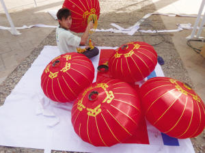 | 2月9日,工人在挂灯笼 |