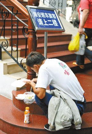 | ↑ 2月11日,海口秀英码头候车大厅里,正在等车的旅客急匆匆地吃午餐。 |