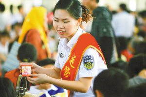 | ↑ 2月11日上午,一名工作人员在海口汽车南站候车大厅内给旅客送水。 |