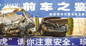为教育和警示机动车辆驾驶人员,贵州黔西南布依族苗族自治州交警部门在该州一条主要公路的收费站旁设置了由违章肇事报废车辆和事故现场图片组成的“前车之鉴”展示台。 新华社记者 刘续 摄 |