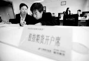 | 2月22日,一名开户客户(前右)在北京银河期货有限公司进行股指期货知识测试。根据股指期货上市工作的总体安排,中国金融期货交易所决定,股指期货投资者需要“有知识、有经验、有资金”。 新华社记者 邢广利 摄 |