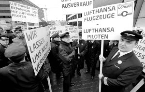 | 2月22日,在德国法兰克福机场,汉莎航空公司的飞行员手举标语参加罢工。