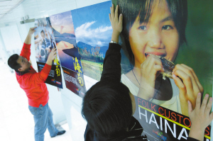 | 2月22日,首批国际旅游岛宣传海报印制完成。据了解,目前,首批不同系列不同画面的宣传海报共2.4万张,将于首届博鳌国际旅游论坛开幕前在机场、码头及酒店等公共场所张贴,宣传海南旅游资源。图为工作人员在张贴海报。 本报记者 张杰 摄 |