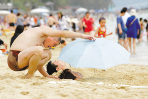 | 2月22日,亚龙湾的海滩上,游客们在享受温软细沙带来的乐趣。 本报记者 苏建强 摄