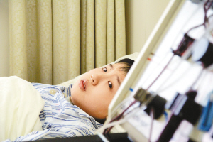 2月25日,邵帅躺在病床上,医生正通过体外循环采集造血干细胞。 12岁的江苏徐州男孩邵帅,在母亲邵丹被查出身患白血病后,勇敢提出要为妈妈捐献骨髓血和造血干细胞。在配型成功以后,2月24日,北京市道培医院的医生从邵帅身上采集了500毫升骨髓血;2月25日,邵帅又献出了约100毫升造血干细胞。 新华社发
