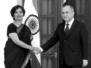 2月25日,印度外交秘书尼鲁帕玛·拉奥(左)在印度新德里会见巴基斯坦外交秘书萨尔曼·巴希尔。印度与巴基斯坦当天在新德里开始举行外交秘书级会谈。这是自2008年孟买发生恐怖袭击以来两国首次进行官方会谈。 新华社发