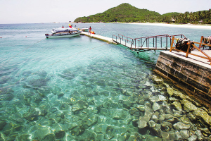 由于小岛地处三亚海棠湾内,避开了台风走廊,这里乔木高大挺拔,灌木茂盛葳蕤。岛西及北部地势渐平,一弯沙滩,沙质细白。海水清澈透明,最高能见度达27米。神奇的海底世界丛生着五彩斑斓、形态各异的珊瑚,是海南沿岸自然资源保护最完整的地区,堪称中国第一潜水胜地。