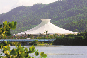 美丽之冠是三亚市地标性建筑,是三亚市的美丽门户。进入三亚市区,首先映入眼帘的就是美丽之冠,它依山傍水,乳白色膜盖在骄阳下熠熠生辉,犹如一朵巨型花冠呈现在万绿丛中。