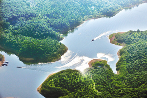 云月湖位于儋州市西南6公里处,毗邻洋浦开发区,方圆15平方公里,是镶嵌在海南岛西部的一颗明丽的蓝宝石。这里四周青山环绕,林木叠翠,山川逶迤。山脚陡斜,凹落成天然的低洼山谷大盆地,盆地荡漂着波光粼粼的湖水,水波不惊,青山飘浮于湖面。湖畔有大片橡胶林、木麻黄林,山绿水绿,构成一幅绿色基调的水彩画。
