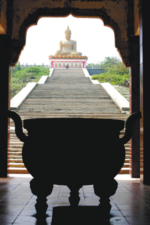 铜鼓岭佛光寺是由海南文昌籍泰国华人陈颖杜先生于1993年出资,仿泰国芭堤雅山顶释迦牟尼佛像和佛寺建造的,被誉为“铜鼓佛光”。佛像总高16米,面 向南海,有长86米,宽21.6米的151级台阶甬道和佛殿连通。 佛光寺内还供奉着河南少林寺第32代武僧释行佛禅师在闭关修行时,手刺舌血抄写成的经书《般若波罗蜜多心经》。此卷经书与三亚南山佛教文化苑的《般若波罗蜜多心经》石刻、定安县博物馆珍藏的清代进士莫绍德楷书《般若波罗蜜多心经》拓片并称为海南“《心经》三宝”。