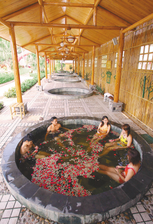 官塘温泉位于琼海市西南部,地热田分布于万泉河南岸,长约9公里,宽1公里至1.7公里,面积约13平方公里。勘探区西起蓝山村,东北至官塘村,面积32平方公里。以勘探区为中心,区域地热地质调查面积240平方公里。该地热田属低温地热田,分为官塘和蓝山2个矿热水区。热矿泉出露于燕山期侵入岩中。官塘地热田官塘热矿水区热矿水及周边地下温水允许开采量合计10700立方米/天。