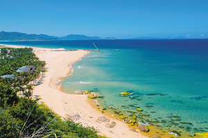 日月湾兴建的度假村,已有一幢设计精巧别具一格的楼房落成。楼房有装修精美,设备齐全的标准客房和豪华客房、餐厅、舞厅、会客厅、会议室,样样俱全。海边筑有防潮堤坝,堤边建有淡水游泳池。游客在海上玩够后,还可进入淡水池游泳。