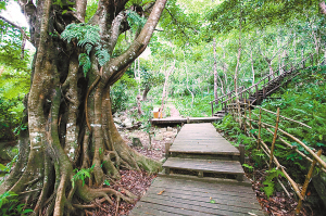 五指山热带雨林栈道以五指山市区南圣河支流太平溪连心桥段为起点,溯溪而上,蜿蜒直抵太平山风景区核心区域,以太平山北麓翡翠阁观景楼为终点,全长3.8公里。沿路景观峻美多姿,栈道嵌壁,绿色长廊,移步换景,奇石叠垒,碧潭盈底,溪流淙淙,原生植被丰富,种类繁多,生态旅游资源极为丰富。