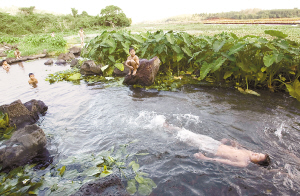 久温塘火山冷泉位于定安县龙门镇久温塘村,该冷泉是中国继台湾岛苏澳冷泉、黑龙江五大连池冷泉之后的第三大冷泉,也是迄今为止发现的中国最大的热带富硒冷泉。日自涌量达4万立方米,无色、无味、清澈透明,常年水温23℃~25℃,夏凉冬暖,清甘可口,符合饮用天然矿泉水最佳标准。它含硒和锗等多种抗肿瘤防癌元素,既可提高免疫力、治疗心血管疾病,又可以饮用、泡浴,可促进血液循环,使人心旷神怡,延长寿命。冷泉地带植被保护得非常好,满目青葱,古榕连片,怪石嶙峋,卵石遍野。近百股清泉源头,从石缝里汩汩流淌,泉水叮咚,汇集成塘,流归万泉河,四季陌上花开,小鱼如织,彩蝶围绕泉边翩翩飞舞,人如在画中,是清暑纳爽、休闲养生的好去处。