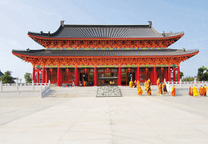重建之永庆寺,位于澄迈老城开发区盈滨半岛,为现今琼北地区规模最大的佛教寺院。寺院占地约80亩,建筑面积约9200平方米。大雄宝殿及各殿供奉之四十二尊佛像均采用整块缅甸白玉精雕细琢而成,法相殊妙,莹白光润,乃世所罕见。
