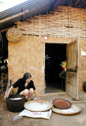 | 黎家妇女在屋前筛米。 |