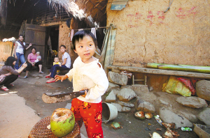 | 一位小女孩在茅屋前砍椰子。