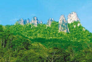 七仙岭七峰似人的掌指竖立,直指苍穹。前峰高大,海拔1107米,后六峰相依而小。当晨雾浮盖时,远眺中的七仙岭,酷似七位姐妹披着薄纱直立,端庄窈窕;时近中午,云雾消散,此时的七仙岭又像七把利剑直指云天,气势十分雄伟。