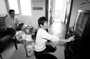 | 2月6日, 海口市美兰区岭下廉租房小区,陈志刚、曾容妹夫妻俩和女儿一家子赶在春节前一个月搬进了“不用再花钱装修就可以住进来”的 40多平方米廉租房。住进新房,陈志刚、曾容妹夫妻看着电视,笑开了颜。 本报记者 张杰 摄 |