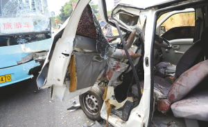旅游大巴“出轨” 小面包车遭殃 2月25日下午1时40分许,三亚市榆亚路,一辆旅游车违章越双黄线,撞上对面行驶的一辆面包车,导致面包车严重受损,面包车驾驶员多处骨折,生命垂危。 本报记者 苏建强 摄