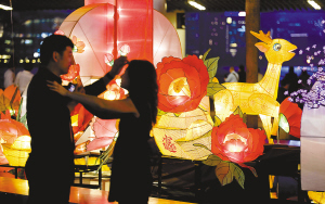 2月25日,两名游客在香港文化中心拍摄彩灯。 元宵佳节将至,香港许多地方都装置彩灯增添喜庆气氛。 新华社记者 吕小炜 摄