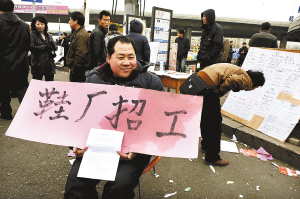 | 2月25日,杭州路劳动力市场外,一鞋厂招工代表在等候求职者。 新华社发 |