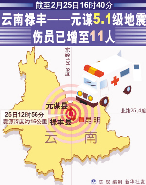 25日,云南省楚雄彝族自治州禄丰县、元谋县交界处发生了5.1级地震,禄丰、元谋、姚安、大姚、祥云、牟定等地有强烈震感,昆明市普遍有震感。
