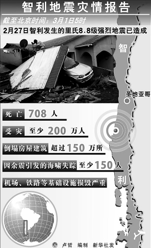 智利总统巴切莱特2月28日下午在圣地亚哥对媒体宣布,27日智利发生的里氏8.8级强烈地震已经造成708人死亡,随着时间推移这一数字还可能继续增加。