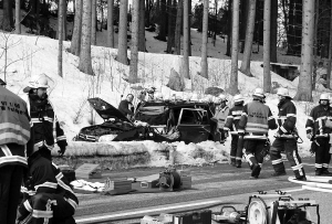2月28日,在德国南部的费尔德贝格,救援人员在一辆因被暴风刮倒的树木砸到而造成车祸的汽车旁忙碌。 新华社/法新