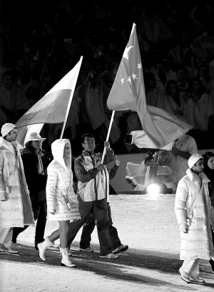 | 中国体育代表团在闭幕式上入场,旗手为赵宏博。 新华社发 |